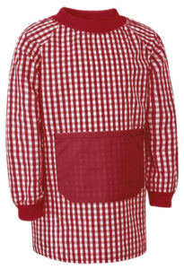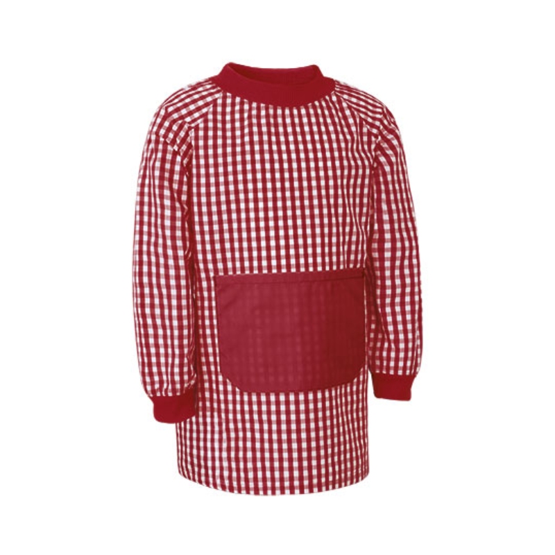 Bata infantil sin cierre (tipo jersey). Confeccionada en tejido con motivo tradicional a cuadros. Cuello y puños de canalé en color liso, a contraste. Bolsillo grande en la parte delantera en color liso, a contraste. Amplia tirilla cosida en el interior del cuello, para poder colgar la prenda en una percha. Indicada para su uso por los niños más pequeños en guarderías y escuelas infantiles, de muy fácil colocación por encima de la ropa habitual. 65% POLIÉSTER – 35% ALGODÓN, 150 GSM.