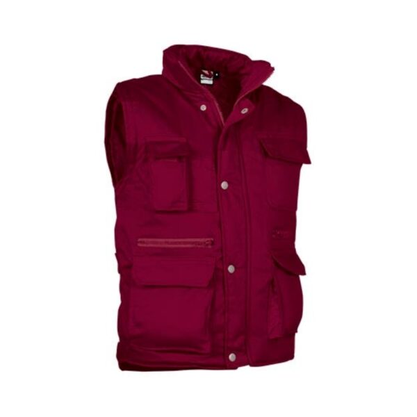 Chaleco multibolsillos confeccionado en tejido de sarga con relleno acolchado y forro interior. Cuello alto y cremallera frontal entera. Incluye una tapeta sobre la cremallera, con cierres de presión. Ocho bolsillos en la cara exterior, incluyendo dos departamentos para bolígrafo y un bolsillo para el teléfono móvil. Un bolsillo interior y reguladores con cierre a presión en los laterales para un mejor ajuste. Cortavientos con elástico en las bocamangas. Espalda más larga con faldón en la parte inferior. Amplia superficie en la espalda y cremallera interior para facilitar el marcaje.