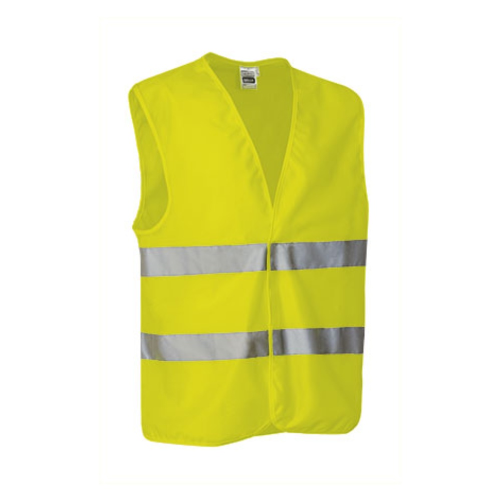 Chaleco de alta visibilidad ligero, elaborado con tejido 100% poliéster. Cuello en pico con cierre central de velcro. Con dos cintas retrorreflectantes en gris plata. Terminación ribeteada en cuello, hombros y bajo. Cumple normativa EN ISO 20471:2013 / A1:2016 (Clase 2).