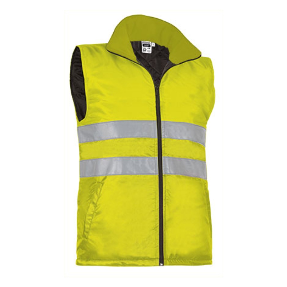 Chaleco confeccionado en tejido Oxford con recubrimiento de poliuretano, relleno acolchado y forro interior a contraste. Cuello alto con interior en tejido polar y cremallera frontal entera. Dos bolsillos delanteros con cremallera y un bolsillo interior en pecho izquierdo, también con cremallera. Incluye dos bandas de material retrorreflectante cosidas en el contorno de la prenda, por debajo del pecho. Disponible en un amplio colorido. Cumple normativa EN ISO 20471:2013 / A1:2016 (Clase 1).
