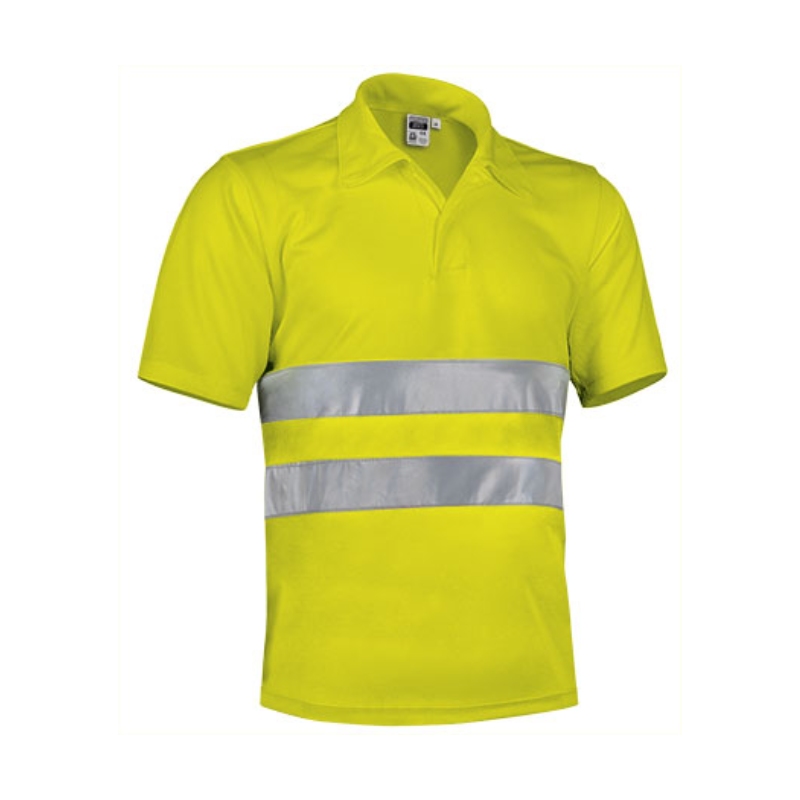 Polo manga corta de alta visibilidad, confeccionado en tejido move-dry ligero y transpirable. Cuello polo con tapeta y dos botones. Incluye dos bandas de material retrorreflectante cosidas en el contorno de la prenda, por debajo del pecho. Disponible en un amplio colorido. Cumple normativa EN ISO 20471:2013 / A1:2016 (Clase 1).